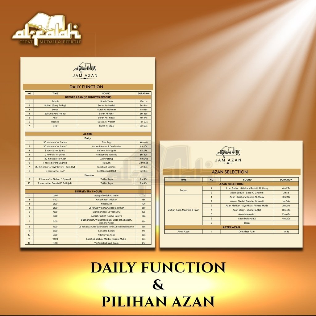Memaparkan Waktu Solat beserta Syuruk (𝟏𝟎𝟎% 𝐖𝐚𝐤𝐭𝐮 𝐒𝐨𝐥𝐚𝐭 𝐉𝐀𝐊𝐈𝐌) Melaungkan Azan (𝐏𝐚𝐝𝐚 𝐖𝐚𝐤𝐭𝐮𝐧𝐲𝐚) Zikir (𝐒𝐞𝐭𝐢𝐚𝐩 𝟏𝐣𝐚𝐦) Bacaan Ruqyah (𝟏𝐣𝐚𝐦 𝐒𝐞𝐛𝐞𝐥𝐮𝐦 𝐌𝐚𝐠𝐡𝐫𝐢𝐛) Takbir Hari Raya (𝐀𝐢𝐝𝐢𝐥 𝐅𝐢𝐭𝐫𝐢 & 𝐀𝐢𝐝𝐢𝐥 𝐀𝐝𝐡𝐚) Bacaan Al Quran (𝐒𝐮𝐫𝐚𝐡-𝐒𝐮𝐫𝐚𝐡 𝐏𝐢𝐥𝐢𝐡𝐚𝐧).